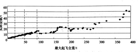 模式識別按照此過程原理,我們收集了2007年中國各機(jī)場起降航班的相關(guān)數(shù)據(jù),選擇了包括:最大起飛全重、機(jī)型、發(fā)動(dòng)機(jī)類型、飛機(jī)排放量、最大座位數(shù)、航空公司、機(jī)場貨運(yùn)代理人數(shù)量、跨境物流貨物重量、起飛距離、機(jī)要長度、飛行架次等屬性。根據(jù)研究的需要進(jìn)行各屬性間的關(guān)聯(lián)性分析。經(jīng)檢驗(yàn),最大起飛全重和實(shí)際業(yè)載兩個(gè)屬性最能體現(xiàn)飛機(jī)經(jīng)濟(jì)分類的特性。