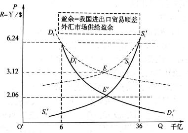 事實上,當我國外貿(mào)商品外匯供給與需求彈性較大時,如D,與S:運行所示,人民幣貶值10%,即可以實現(xiàn)均衡。不過,由于經(jīng)濟機理作用,均衡的E點并不是我們初始狀態(tài)的缺口4000億美元。因為供需曲線運行后交于E點,E點標識的均衡外匯供需市場規(guī)模是10000億美元,缺口是2000億美元。這2000億美元是我們通過國際物流達到如D:與S所示,人民幣需要貶值100%才可以達到均衡。同樣,這時的E’點標識的均衡外匯供需市場美元規(guī)模是10000億美元,缺口是2000億美元。這2000億美元是我們通過人民幣貶值達到的可預(yù)期的物流出口貿(mào)易規(guī)模。